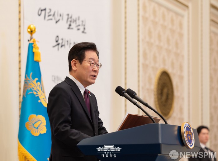 [서울=뉴스핌] 이재명 대통령이 지난 22일 서울 종로구 청와대 영빈관에서 열린 대한노인회 초청 오찬에서 인사말을 하고 있다. [사진=대통령실] 2025.12.23 photo@newspim.com