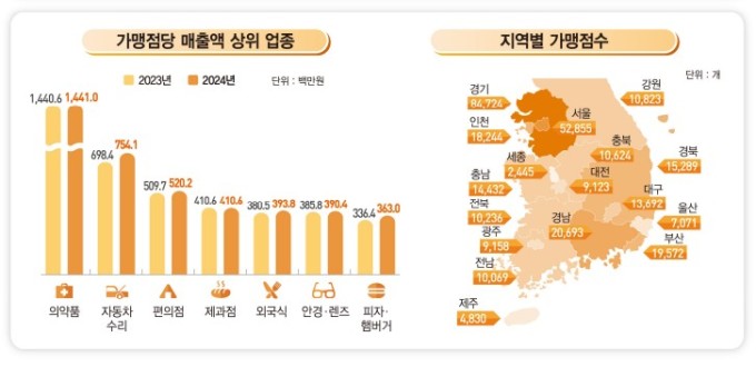 가맹점당 평균 매출액은 2.7% 증가한 3억7523만원으로 나타났다. 가맹점당 매출액 상위 업종은 의약품(14억4102만원), 자동차 수리(7억5407만원), 편의점(5억2018만원)으로 조사됐다.