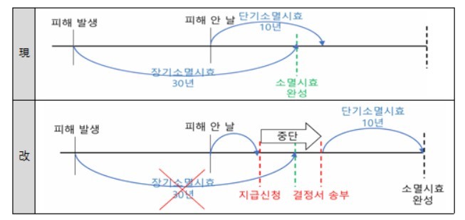피해자 손해배상청구권 강화 차원에서 장기 소멸시효는 폐지하고, 배상금 신청부터 지급 결정기간 동안은 단기 소멸시효 진행을 중단한다.