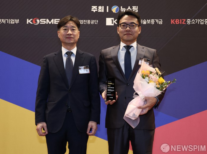 [서울=뉴스핌] 최지환 기자 = 박용순 중소벤처기업부 중소기업정책실장이 24일 오전 서울 영등포구 금융투자협회에서 뉴스핌 주최로 열린 대한민국 AI 중소기업 혁신 대상에서 김동환 포티투마루 대표에게 대상인 중소벤처기업부 장관상을 시상하고 함께 기념촬영을 하고 있다. 2025.12.24 choipix16@newspim.com