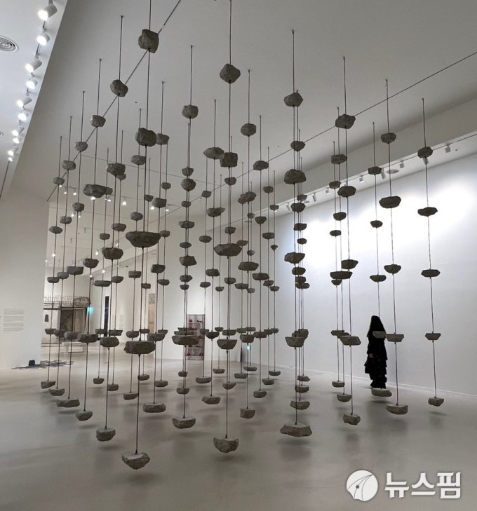 [서울=뉴스핌] 제주 포도뮤지엄의 기획전 '우리 이토록 작은 존재들'의 도입부에 설치된 모나 하툼의 설치미술 'Remains to be seen' (2019). 1.6톤에 달하는 콘크리트 덩어리들이 가는 철근으로 공중에 매달려 있다. 평온함과 위태로움 사이에서 미묘한 긴장감을 전해주는 작품이다. [사진=이영란 미술전문기자] 2025.12.25 art29@newspim.com