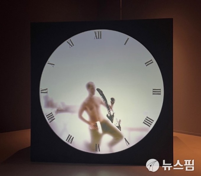 [서울=뉴스핌] 마르텐 바스(Maarten Baas), '리얼 타임 XL 더 아티스트'. 작가가 1분마다 시계의 시침과 분침을 바꾸는 퍼포먼스를 12시간 지속한 영상작품으로, 실제 사람이 입체 구조물 속에 갇혀 있는 듯한 착각을 주는 흥미로운 작품이다. [사진=이영란 미술전문기자] 2025.12.25 art29@newspim.com