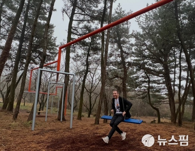 [서울=뉴스핌] 포도뮤지엄 야외 솔숲에 3인용 그네 '하나 둘 셋 스윙'을 설치한 3인조 콜렉티브 수퍼플렉스의 야콥 펭거가 그네에서 포즈를 취했다. 야콥 펭거는 "함께 마음을 합칠 때 변화와 유쾌한 움직임이 가능하다"는 메시지를 전하는 작품이라고 소개했다. 모듈식 이 그네는 전세계 다양한 장소에 설치돼 있고, 누구나 타볼 수 있다. [사진=이영란 미술전문기자] 2025.12.25 art29@newspim.com
