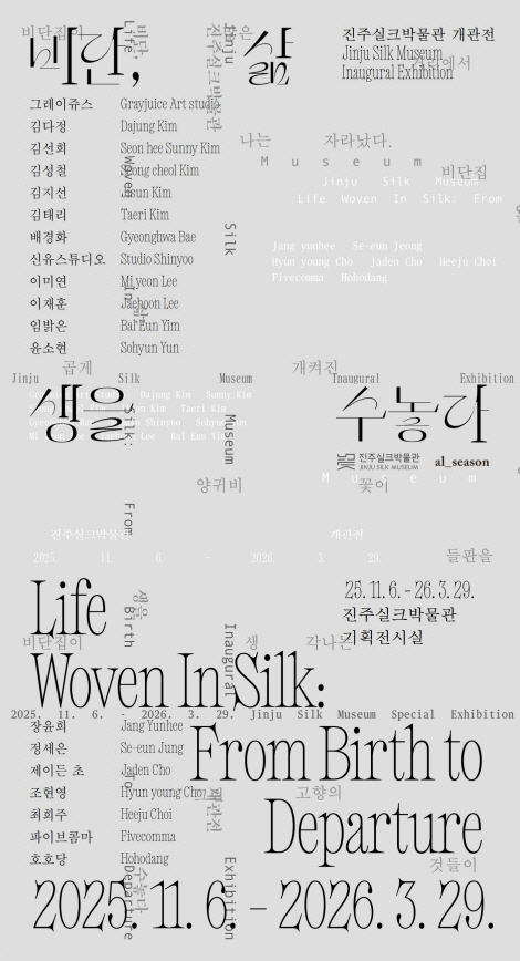 지난 11월 문을 연 진주실크박물관은 개관 기념전 '비단 삶 : 생을 수놓다'를 선보이고 있다. 실크의 역사와 제작 과정을 다룬 상설전시와 더불어, 빛과 음악, 영상으로 진주실크의 미적 감각을 표현한 미디어아트가 상영된다. 28일까지는 '실크과학랩(Silk Science Lab)' 체험 프로그램을 통해 시민들이 실크의 과학적 특성을 직접 배울 수 있다.