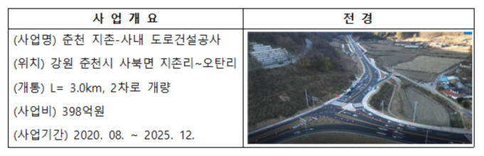 강원 춘천시 지촌~사내 구간(국도56호선)은 이달 30일 오후 3시 개통된다. 해당 구간은 급커브와 협소한 도로 폭으로 사고 위험이 컸던 곳으로, 2차로 개량을 통해 주행 안전성이 크게 개선될 것으로 기대된다.