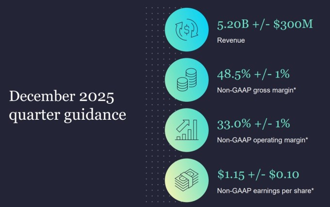 12월 마감 분기 전망도 밝다. 회사는 매출 52억 달러(±3억 달러), 조정 EPS 1.15달러(±0.10달러)를 제시했으며, 이는 시장 예상치인 48억1천만 달러, 1.04달러를 각각 상회한다. 비일반회계원칙(Non-GAAP) 기준 총이익률은 48.5%(±1%), 영업이익률은 33.0%(±1%)로 전망됐다.