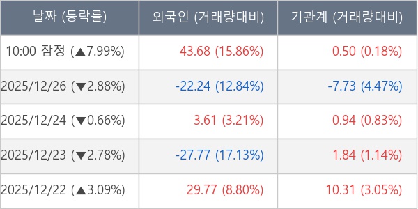 [서울=뉴스핌] 로보뉴스 = 29일 10시 15분 현재 대한전선(001440)은 외국인과 기관이 각각 43.68 만 주, 0.50 만 주 순매수(잠정) 하면서 전일 대비 7.99% (현재가 23,650원) 상승하고 있다.
