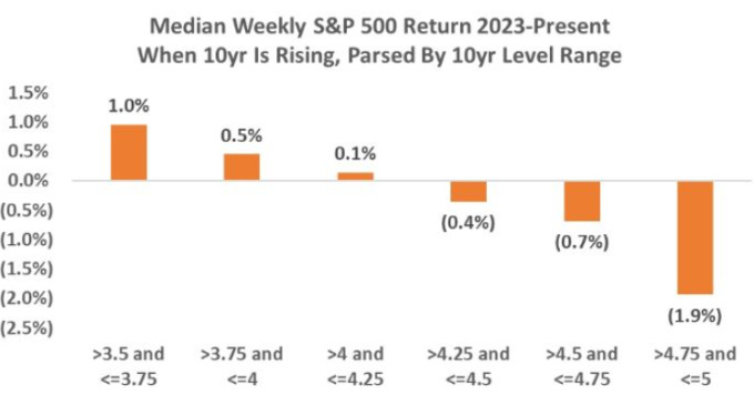 2023년 이후 10년물 국채 금리(상승 국면) 구간별 S&P500의 주간 변동률 중앙값 [자료=파이퍼샌들러]