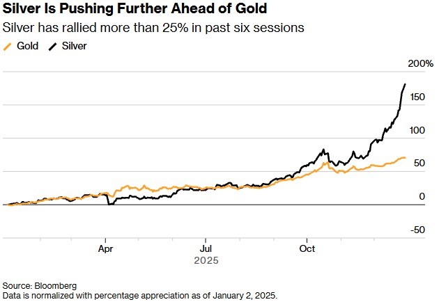 단기적으로는 변동성은 주식보다 귀금속 시장에서 경계를 요하는 조언이 많다. 시세가 사상 처음으로 온스당 80달러를 돌파한 은을 두고서다. 블룸버그통신에 따르면 은 현물 가격은 29일 아시아 시간 오전 5% 넘게 급등한 83.65달러를 기록했다. 이로써 은 현물 가격은 6거래일 연속 상승세다. 관련 기간 상승폭은 25%를 넘는다.