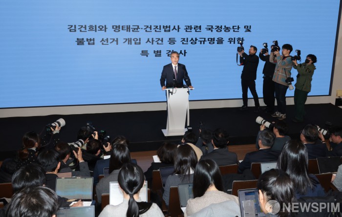 [서울=뉴스핌] 이길동 기자 = 김건희 씨 의혹을 수사한 민중기 특별검사가 29일 서울 종로구 KT광화문빌딩에 마련된 특검 사무실에서 최종 수사 결과를 발표하고 있다. 2025.12.29. gdlee@newspim.com