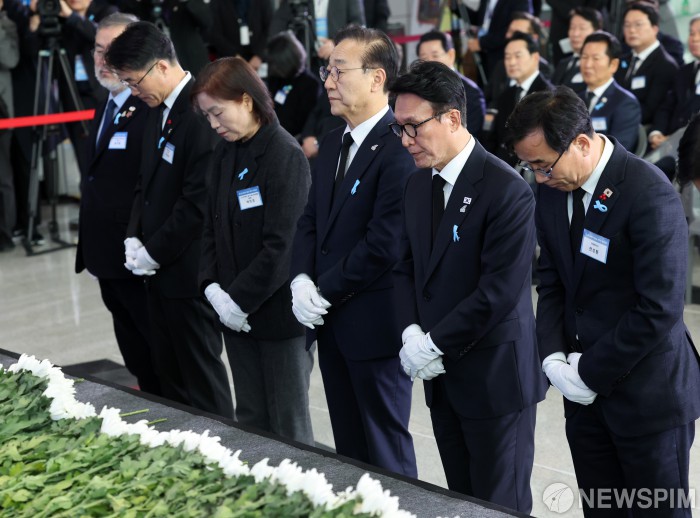 [서울=뉴스핌] 사진공동취재단 = 김민석 국무총리 등 정부 대표가 29일 오전 전남 무안군 무안국제공항에서 열린 '12.29 제주항공 여객기 참사 1주기 추모식'에서 헌화하고 있다. 2025.12.29 photo@newspim.com