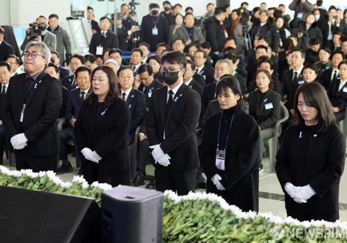 [서울=뉴스핌] 사진공동취재단 = 29일 오전 전남 무안군 무안국제공항에서 열린 '12.29 제주항공 여객기 참사 1주기 추모식'에서 유가족 대표들이 헌화하고 있다. 2025.12.29 photo@newspim.com