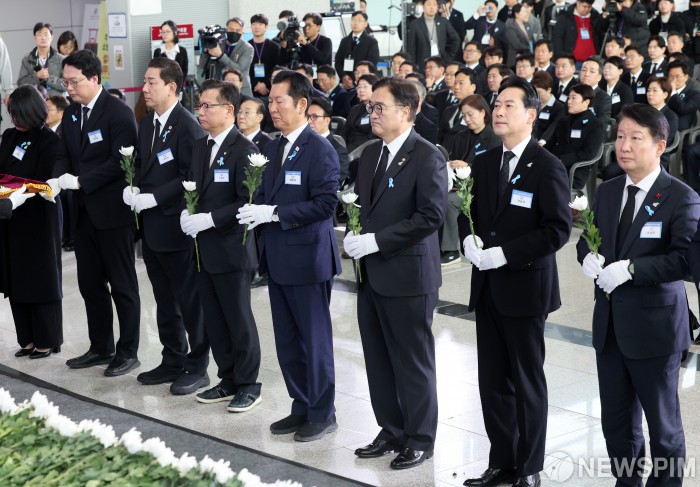 [서울=뉴스핌] 사진공동취재단 = 김민석 국무총리 등 정부 대표가 29일 오전 전남 무안군 무안국제공항에서 열린 '12.29 제주항공 여객기 참사 1주기 추모식'에서 헌화하고 있다. 2025.12.29 photo@newspim.com