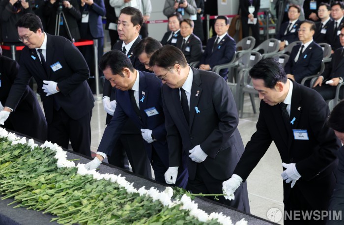 [서울=뉴스핌] 사진공동취재단 = 우원식 국회의장, 정청래 더불어민주당 대표, 장동혁 국민의힘 대표, 천하람 개혁신당 원내대표 등 국회 대표가 29일 오전 전남 무안군 무안국제공항에서 열린 '12.29 제주항공 여객기 참사 1주기 추모식'에서 헌화하고 있다. 2025.12.29 photo@newspim.com