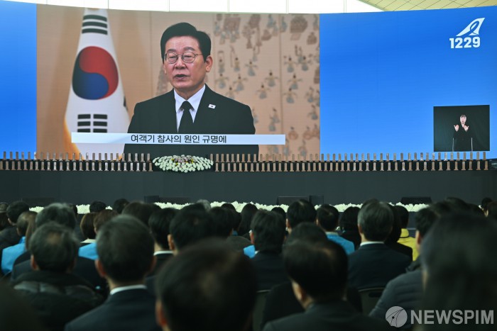 [서울=뉴스핌] 사진공동취재단 = 12·29 제주항공 여객기 참사 1주기인 29일 오전 전남 무안국제공항에서 열린 참사 1주기 추모식 도중 이재명 대통령의 영상 메시지가 재생되고 있다. 2025.12.29 photo@newspim.com