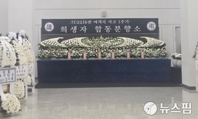 이날 김포공항 분향소에 있는 게시판에는 '많이 보고 싶다', '소중한 동료들 모두 편히 쉬시라', '1년이 지났어도 잊지 않겠다' 등 백편이 넘는 글이 적혀 있었다. 제주항공 참사로 사망한 이들과 조종사, 부조종사, 객실 승무원들의 위패 6개 옆에는 하얀 국화꽃들이 놓여 있었다.