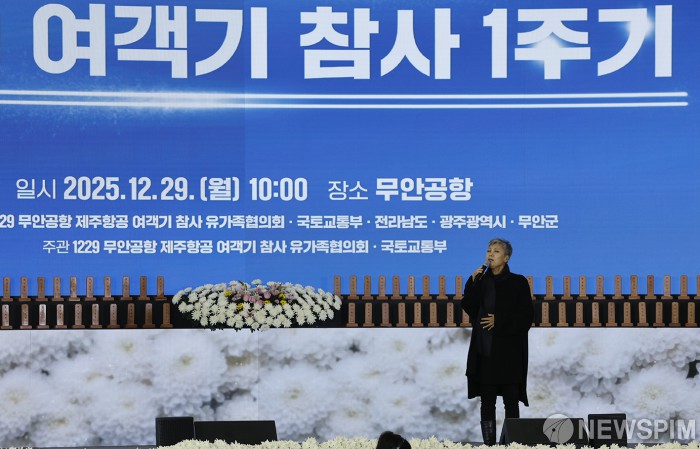 [서울=뉴스핌] 사진공동취재단 = 12.29 제주항공 여객기 참사 1주기인 29일 무안국제공항에서 열린 추모식에서 가수 이은미씨가 무대에 올라 노래로 유가족들의 아픔을 달래고 있다. 2025.12.29 photo@newspim.com