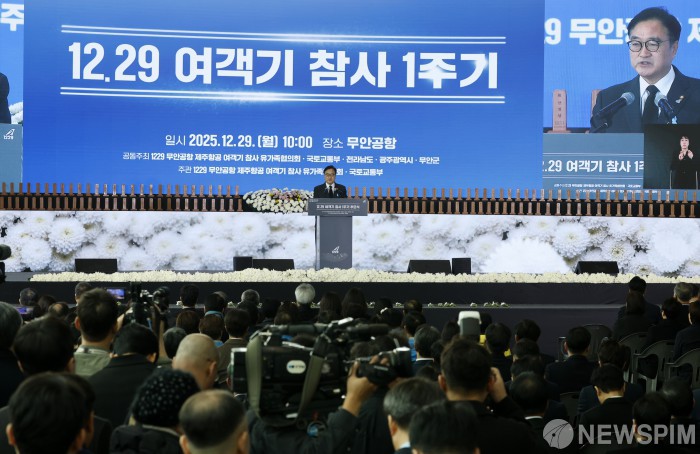 [서울=뉴스핌] 사진공동취재단 = 우원식 국회의장이 29일 오전 전남 무안군 무안국제공항에서 열린 '12.29 제주항공 여객기 참사 1주기 추모식'에서 추모사를 하고 있다. 2025.12.29 photo@newspim.com