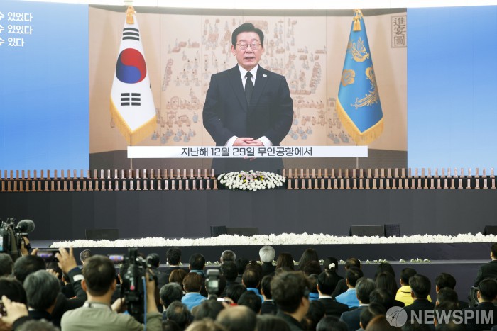 [서울=뉴스핌] 사진공동취재단 = 12.29 제주항공 여객기 참사 1주기인 29일 오전 전남 무안군 무안국제공항에서 열린 '12.29 제주항공 여객기 참사 1주기 추모식'에서 이재명 대통령의 영상 메시지가 재생되고 있다. 2025.12.29 photo@newspim.com