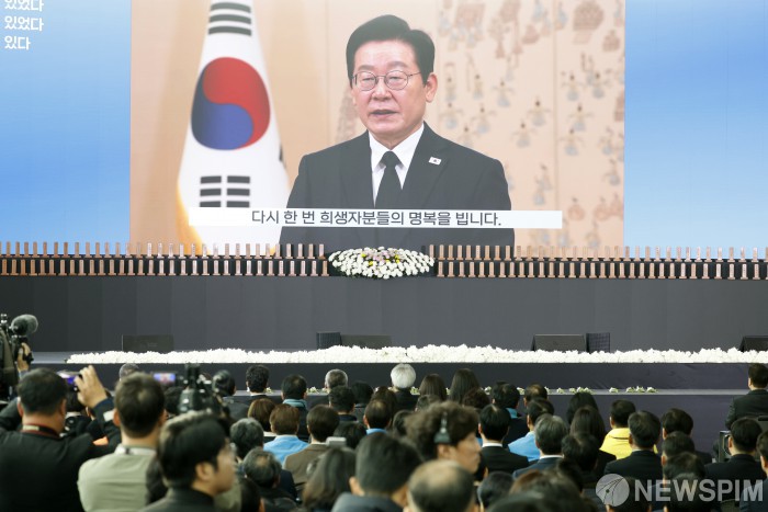 [서울=뉴스핌] 사진공동취재단 = 12.29 제주항공 여객기 참사 1주기인 29일 오전 전남 무안군 무안국제공항에서 열린 '12.29 제주항공 여객기 참사 1주기 추모식'에서 이재명 대통령의 영상 메시지가 재생되고 있다. 2025.12.29 photo@newspim.com