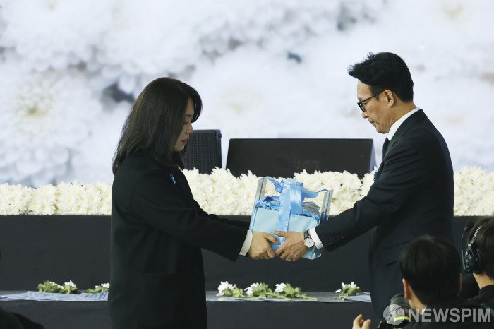[서울=뉴스핌] 사진공동취재단 = 김민석 국무총리가 29일 오전 전남 무안군 무안국제공항에서 열린 '12.29 제주항공 여객기 참사 1주기 추모식'에서 유가족들로부터 진상규명·재발방지책 마련안이 담긴 메시지함을 전달받고 있다. 2025.12.29 photo@newspim.com
