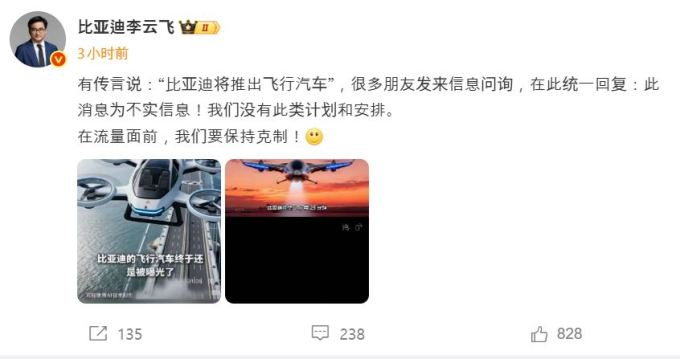 비야디 그룹 브랜드 및 홍보 총괄 매니저인 리윈페이(李雲飛)는 29일 자신의 웨이보를 통해 "최근 비야디가 플라잉카를 출시한다는 소문에 대해 많은 이들이 사실여부를 물어오고 있다"면서 "해당 정보는 사실이 아니며, 그와 관련한 계획이나 일정도 전혀 없다"고 전했다.