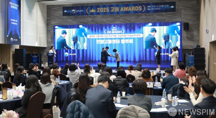 [서울=뉴스핌] 김영훈 고용노동부 장관이 29일 오후 청주 오스콘 컨벤션센터에서 열린 올해의 고용서비스상 시상식에서 상패를 전달하고 있다. [사진=고용노동부] 2025.12.29 photo@newspim.com