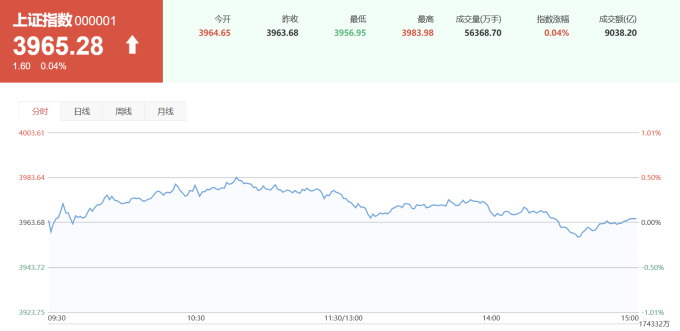 이날 상하이종합지수는 0.04% 상승한 3965.28, 선전성분지수는 0.49% 하락한 13537.10, 촹예반지수는 0.66% 하락한 3222.61로 각각 장을 마감했다.