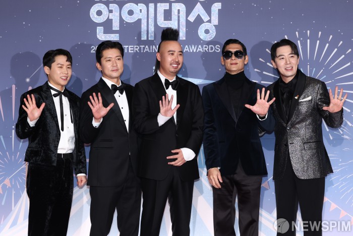[서울=뉴스핌] 최지환 기자 = '푹 쉬면 다행이야' 출연진 양세찬(왼쪽부터), 김대호, 유희관, 박준형, 붐이 29일 오후 서울 마포구 MBC 미디어센터에서 열린 2025 MBC 방송연예대상 시상식 포토월에서 포즈를 취하고 있다. 2025.12.29 choipix16@newspim.com