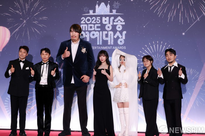 [서울=뉴스핌] 최지환 기자 = '전지적 참견 시점' 출연진 전현무, 양세형, 최홍만, 쯔양, 홍현희, 송은이, 유병재가 29일 오후 서울 마포구 MBC 미디어센터에서 열린 2025 MBC 방송연예대상 시상식 포토월에서 포즈를 취하고 있다. 2025.12.29 choipix16@newspim.com