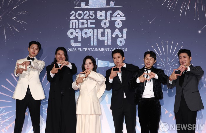 [서울=뉴스핌] 최지환 기자 = '구해줘 홈즈' 출연진 주우재, 임우일, 김숙, 김대호, 양세형, 장동민이 29일 오후 서울 마포구 MBC 미디어센터에서 열린 2025 MBC 방송연예대상 시상식 포토월에서 포즈를 취하고 있다. 2025.12.29 choipix16@newspim.com