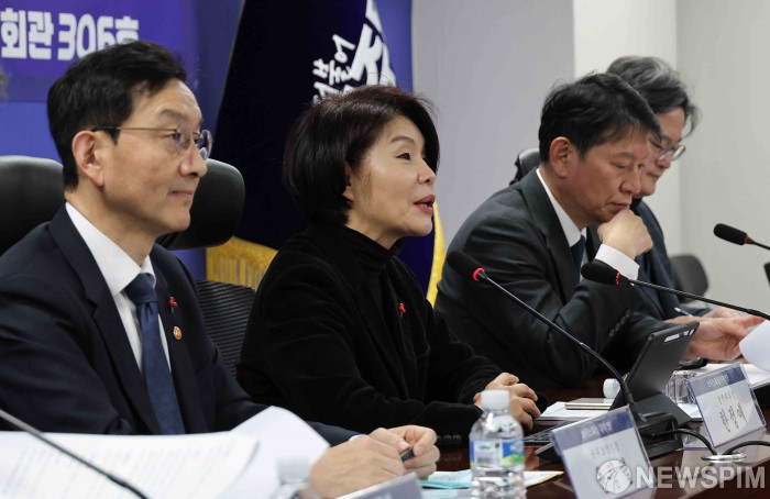 [서울=뉴스핌] 윤창빈 기자 = 한정애 더불어민주당 정책위의장이 30일 서울 여의도 국회에서 열린 보이스피싱대책TF 당정협의에서 모두발언을 하고 있다. 2025.12.30 pangbin@newspim.com