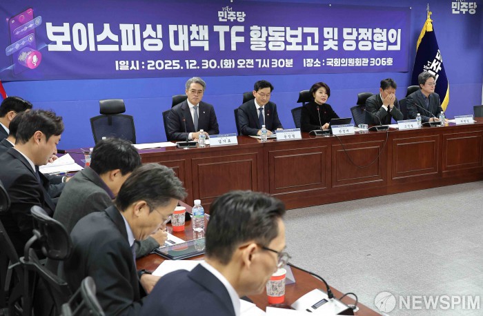 [서울=뉴스핌] 윤창빈 기자 = 한정애 더불어민주당 정책위의장이 30일 서울 여의도 국회에서 열린 보이스피싱대책TF 당정협의에서 모두발언을 하고 있다. 2025.12.30 pangbin@newspim.com