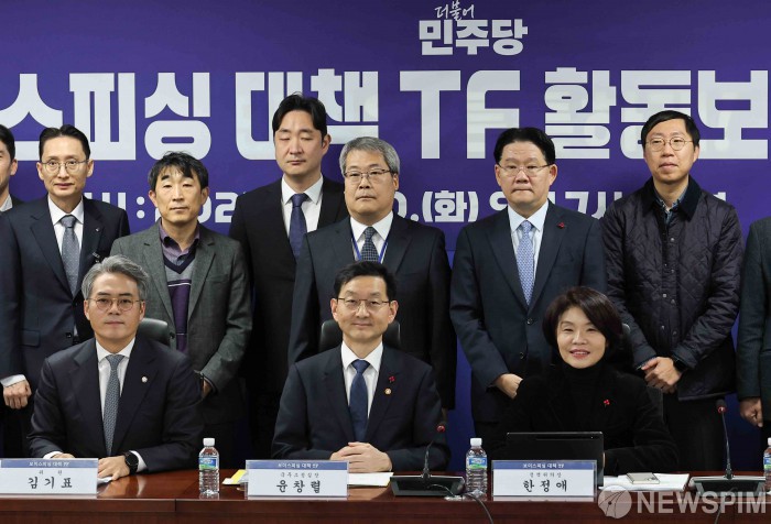 [서울=뉴스핌] 윤창빈 기자 = 한정애 더불어민주당 정책위의장, 윤창렬 국무조정실장 등 참석자들이 30일 서울 여의도 국회에서 열린 보이스피싱대책TF 당정협의에서 기념촬영을 하고 있다. 2025.12.30 pangbin@newspim.com