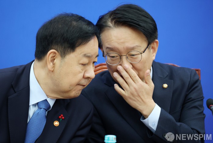[서울=뉴스핌] 정일구 기자 = 권칠승 경제형벌민사책임 TF 단장(오른쪽)과 구윤철 부총리 겸 기획재정부 장관이 30일 오전 서울 여의도 국회에서 열린 경제형벌 민사책임 합리화 제2차 당정협의에서 대화하고 있다. 2025.12.30 mironj19@newspim.com