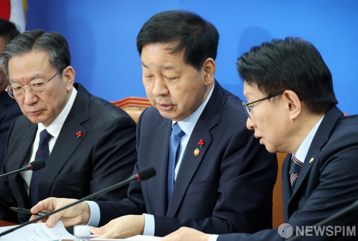[서울=뉴스핌] 정일구 기자 = 권칠승 경제형벌민사책임 TF 단장과 구윤철 부총리 겸 기획재정부 장관이 30일 오전 서울 여의도 국회에서 열린 경제형벌 민사책임 합리화 제2차 당정협의에서 모두발언을 하고 있다. 2025.12.30 mironj19@newspim.com