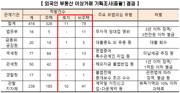 국토부는 지난 11월에 외국인 주택 이상거래 기획조사 결과를 통해 위법 의심거래 210건(위법 의심행위 290건)을 적발해 관계기관에 통보한 바 있다. 이번 조사는 외국인 비주택(오피스텔)·토지 등 이상거래 기획조사 거래신고분 167건에 대한 조사 결과로 위법 의심행위 126건 가운데 위법 의심거래 88건을 적발했다.