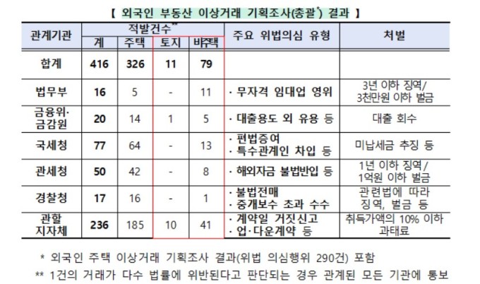 앞서 국토부가 지난달 발표한 외국인 주택 이상거래 기획조사 결과에서도 위법 의심거래 210건, 의심행위 290건이 확인됐다.