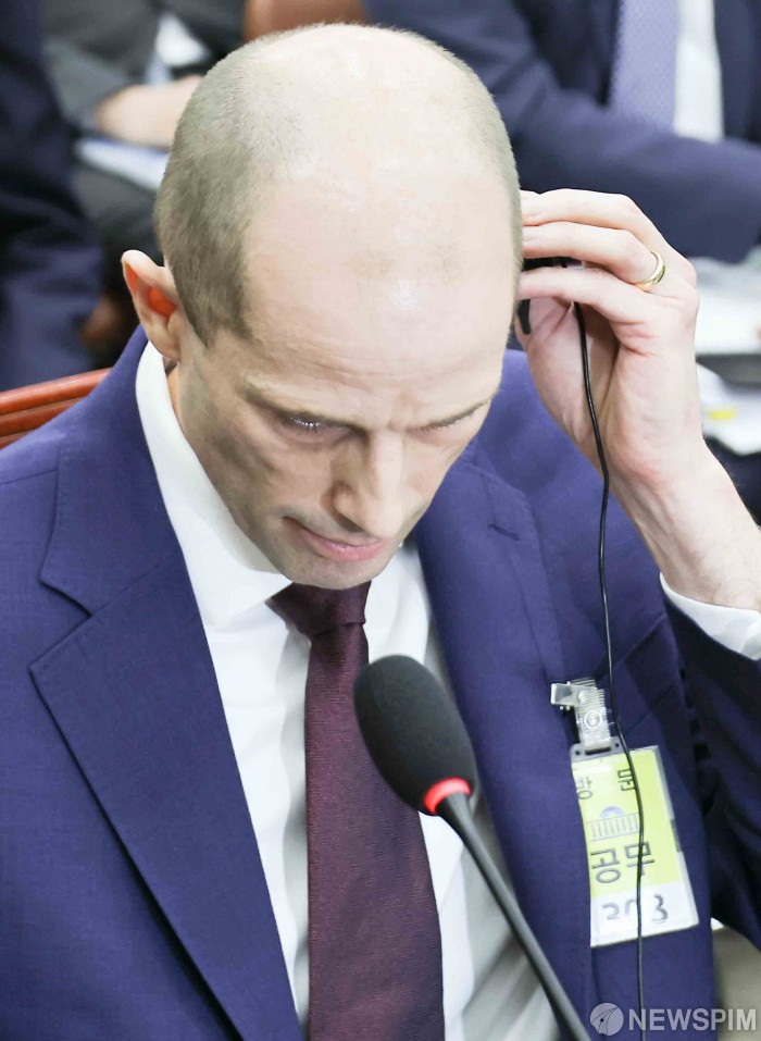 [서울=뉴스핌] 윤창빈 기자 = 해롤드 로저스 쿠팡 임시 대표가 30일 서울 여의도 국회 과학기술정보방송통신위원회 전체회의에서 열린쿠팡 침해사고 및 개인정보 유출, 불공정 거래, 노동환경 실태 파악과 재발방지 대책 마련을 위한 청문회에서 동시통역기를 착용하고 있다. 2025.12.30 pangbin@newspim.com