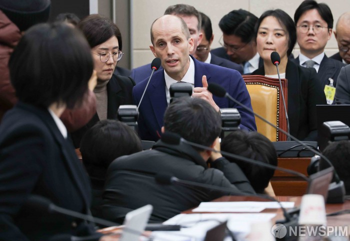 [서울=뉴스핌] 윤창빈 기자 = 해롤드 로저스 쿠팡 임시 대표가 30일 서울 여의도 국회 과학기술정보방송통신위원회 전체회의에서 열린쿠팡 침해사고 및 개인정보 유출, 불공정 거래, 노동환경 실태 파악과 재발방지 대책 마련을 위한 청문회에서 의원 질문에 답변하고 있다. 2025.12.30 pangbin@newspim.com