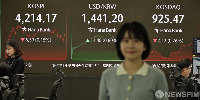 [서울=뉴스핌] 양윤모 기자 = 2025년 증시폐장일인 30일 오후 코스피가 전장 종가보다 6.39 포인트(0.15%) 하락하며 4214.17로, 코스닥은 7.12 포인트(0.76%) 하락한 925.47로 장을 마감한 가운데, 서울 중구 하나은행 딜링룸에서 직원들이 업무를 보고 있다. 서울외환시장에서 달러/원 환율은 전장 대비 11.40원 상승한 1441.20원에 주간거래를 마감했다. 2025.12.30 yym58@newspim.com