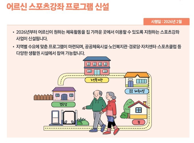 또 2월부터 어르신들이 원하는 체육활동을 거주지 인근에서 즐길수 있도록 스포츠강좌를 무료 제공(지역 내 공공체육시설, 노인복지관, 자치센터 등에 프로그램을 개설한다.