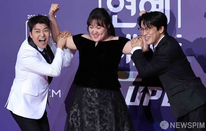[서울=뉴스핌] 윤창빈 기자 = 연예대상 MC를 맡은 전현무, 이수지, 차태현이 30일 서울 마포구 SBS프리즘타워에서 열린 2025 SBS 연예대상 포토월에서 포즈를 취하고 있다. 2025.12.30 pangbin@newspim.com
