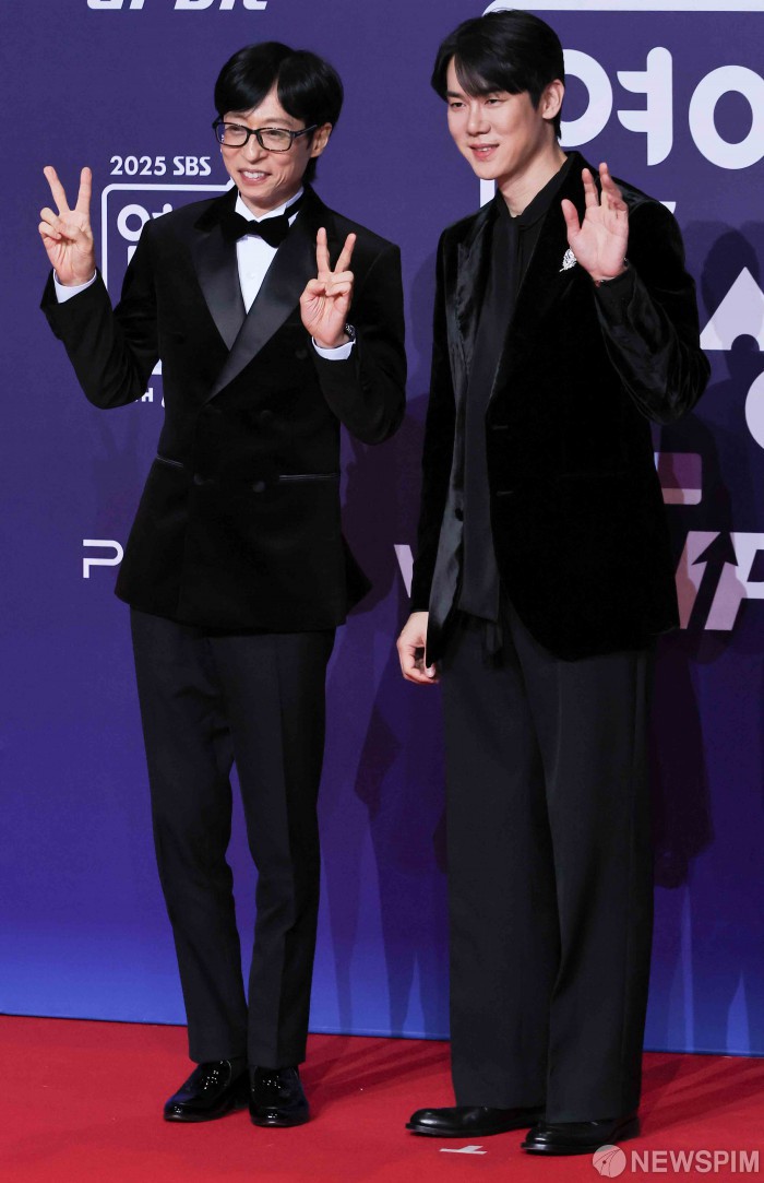 [서울=뉴스핌] 윤창빈 기자 = 예능 틈만 나면(유재석, 유연석) 출연진이 30일 서울 마포구 SBS프리즘타워에서 열린 2025 SBS 연예대상 포토월에서 포즈를 취하고 있다. 2025.12.30 pangbin@newspim.com