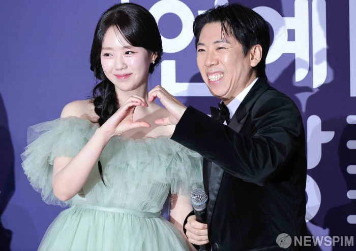 [서울=뉴스핌] 윤창빈 기자 = 예능 런닝맨(지예은, 양세찬) 출연진이 30일 서울 마포구 SBS프리즘타워에서 열린 2025 SBS 연예대상 포토월에서 포즈를 취하고 있다. 2025.12.30 pangbin@newspim.com