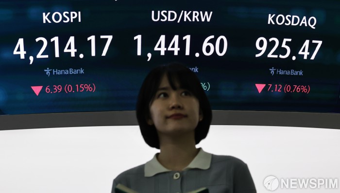 [서울=뉴스핌] 양윤모 기자 = 2025년 증시폐장일인 30일 오후 코스피가 전장 종가보다 6.39 포인트(0.15%) 하락하며 4214.17로, 코스닥은 7.12 포인트(0.76%) 하락한 925.47로 장을 마감한 가운데, 서울 중구 하나은행 딜링룸에서 직원들이 업무를 보고 있다. 서울외환시장에서 달러/원 환율은 전장 대비 11.80원 상승한 1441.60원에 주간거래를 마감했다. 2025.12.30 yym58@newspim.com