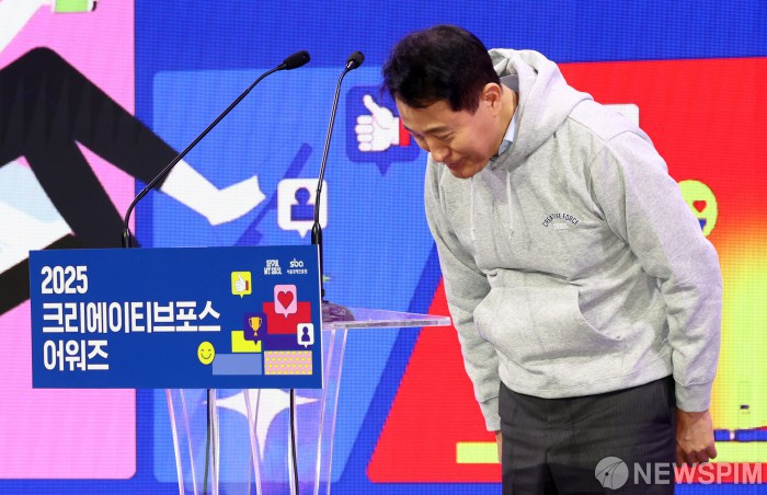 [서울=뉴스핌] 최지환 기자 = 오세훈 서울시장이 31일 오후 서울 중구 동대문디자인플라자에서 열린 2025 서울콘 크리에이티브포스 어워즈에서 환영사를 마치고 고개 숙여 인사하고 있다. 2025.12.31 choipix16@newspim.com