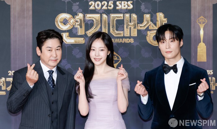 [서울=뉴스핌] 류기찬 기자 = 31일 오후 서울 마포구 SBS프리즘타워에서 열린 ‘2025 SBS 연기대상 시상식 포토월’에서 MC를 맡은 신동엽(왼쪽부터), 채원빈. 허남준이 포즈를 취하고 있다. 2025.12.31 ryuchan0925@newspim.com