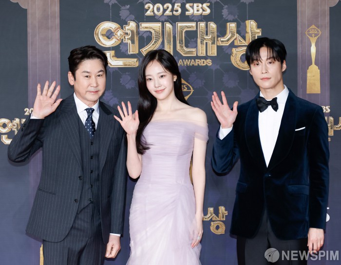 [서울=뉴스핌] 류기찬 기자 = 31일 오후 서울 마포구 SBS프리즘타워에서 열린 ‘2025 SBS 연기대상 시상식 포토월’에서 MC를 맡은 신동엽(왼쪽부터), 채원빈. 허남준이 포즈를 취하고 있다. 2025.12.31 ryuchan0925@newspim.com