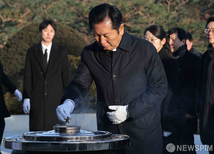 [서울=뉴스핌] 윤창빈 기자 = 정청래 더불어민주당 대표가 1일 오전 서울 동작구 국립서울현충원에서 2026 신년 참배를 하며 분향하고 있다. 2026.01.01 pangbin@newspim.com